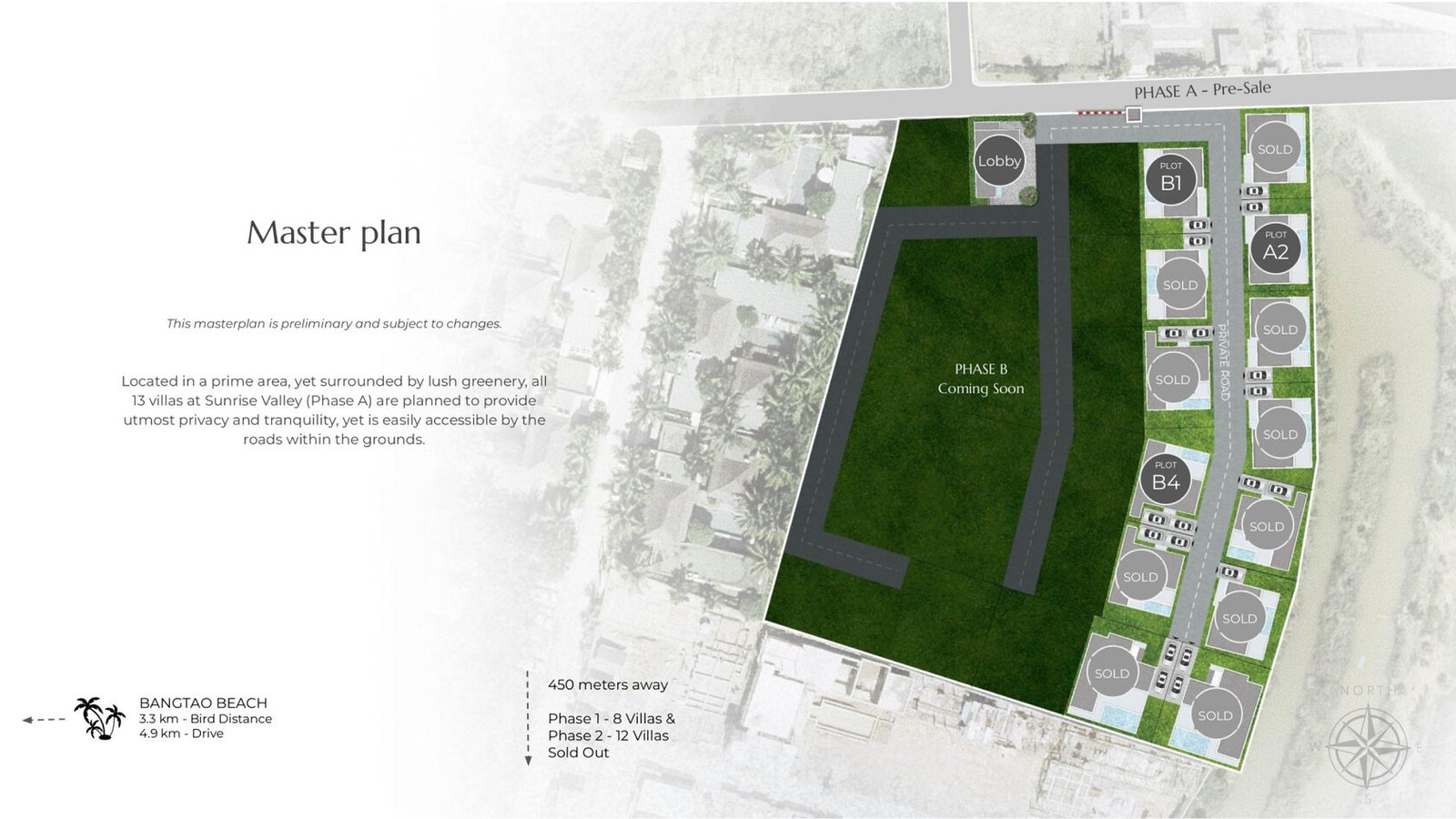Discover the luxury of contemporary living in the sun-drenched landscapes of Phuket at Sunrise Valley. This exclusive complex of 13 private pool villas, surrounded by lush greenery, offers 2 or 3-bedroom villas at very affordable prices. Each villa is fully equipped with bathrooms, a kitchen, sliding windows and doors, floors with white plastered ceilings, lighting, electrical and water systems, an air conditioner and a fan in each bedroom, as well as a fan in each shared room. Located in the prestigious area of Cherngtalay, Bangtao, the villas are just 4.9 km from Bangtao Beach and 6.6 km from Layan Beach. You will be surrounded by restaurants, golf courses, shops, hospitals, and the famous Catch Beach Club. Sunrise Valley Villas combine a desirable location, exquisite design, and impeccable quality, ensuring a high capitalization value for your asset.